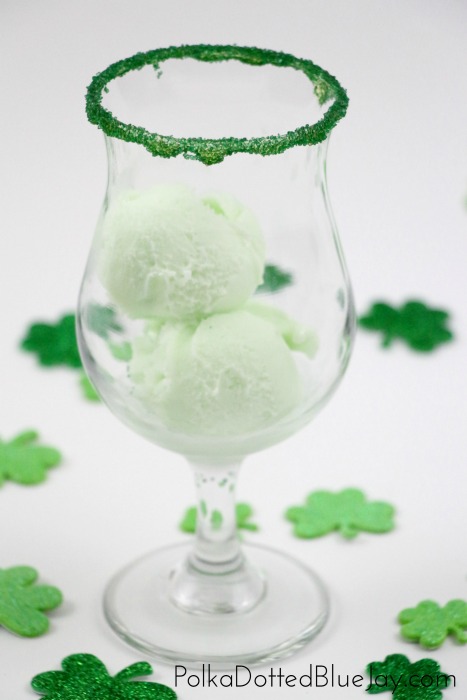 Rim you glass with green sprinkles for added fun. Michael from Inspired By Charm forever changed my life when he gave a rimming tip on his Leprechaun Kiss Martini recipe — use honey for extra sprinkle-sticking power. Genius, right?